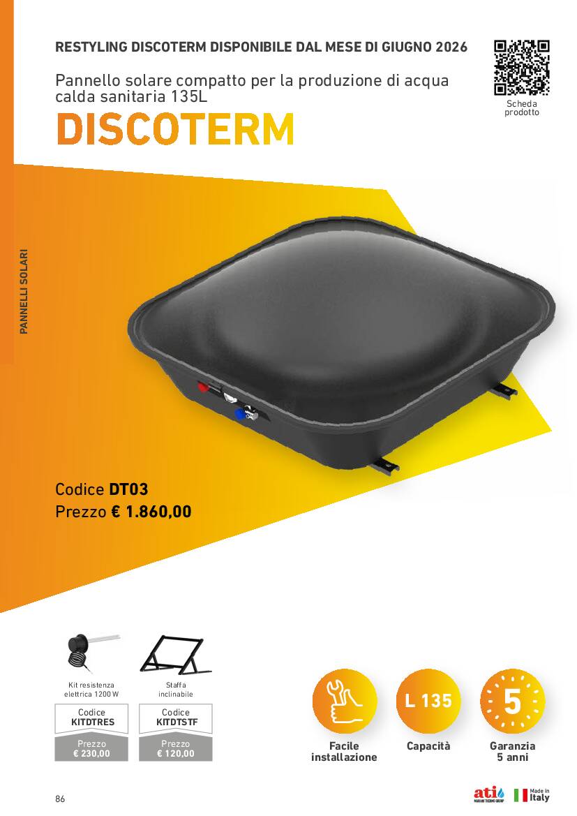 Semplice e rivoluzionario. Discoterm nasce dall’idea vincente di Mario Mariani di creare un prodotto compatto e di semplice installazione ed uso, capace di fornire ACS dall’energia solare. Nato nel 1975, DISCOTERM è stato progressivamente perfezionato sino al modello attuale: un pannello solare ad accumulo diretto e circolazione naturale, con serbatoio da 135 litri vetroporcellanato e anodo al magnesio. DISCOTERM è dotato di una valvola di sicurezza di tipo T&P, attiva anche in presenza di eccessi di temperatura. È un prodotto versatile e può essere utilizzato direttamente, prevedendo l’installazione di un miscelatore a monte delle utenze o facendo arrivare alle utenze acqua già premiscelata. DISCOTERM può anche essere impiegato come integrazione di un impianto preesistente e sfruttato nel periodo invernale come pre-riscaldatore: non teme il freddo ed è certificato per resistere a temperature fino a -20°C. Un piccolo investimento che regalerà un grande risultato sia in termini ecologici che economici.